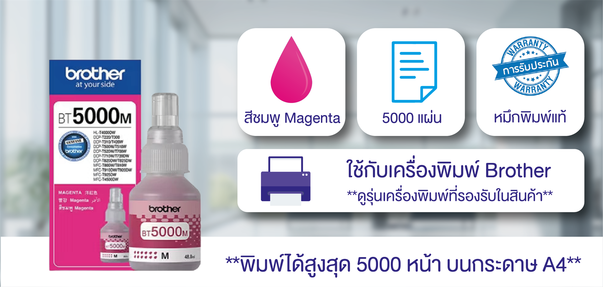 BROTHER หมึกเติม รุ่น BT-5000 M สีชมพูอมม่วง หมึกแท้คุณภาพสูง สีสด ภาพสวยสมจริง พิมพ์งานที่บ้านหรือออฟฟิศ ตัวอักษรจะออกมาคมชัดพร้อมภาพที่คมชัดสดใส