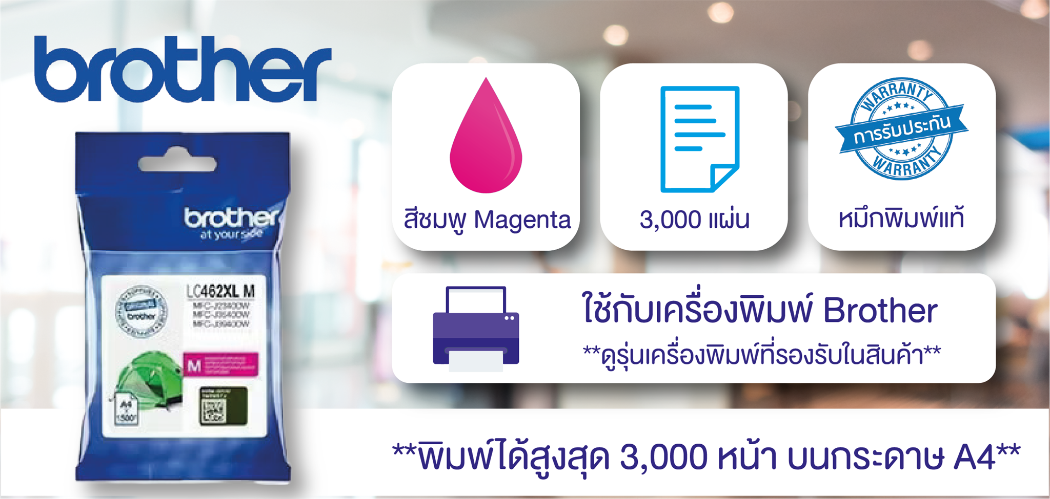 คำแนะนำ: ควรใช้หมึกแท้ Brother LC-462XL M เพื่อคงคุณภาพงานพิมพ์และป้องกันความเสียหายต่อเครื่องพิมพ์, เก็บในที่แห้งและอุณหภูมิปกติ, เขย่าหมึกเบา ๆ ก่อนใช้งานเพื่อให้สีสม่ำเสมอ