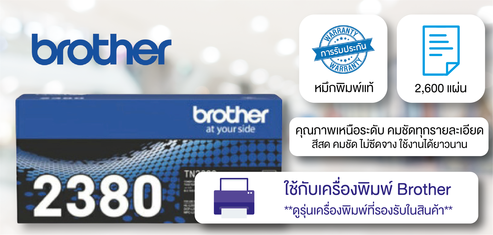 คำแนะนำ: ควรใช้โทนเนอร์แท้ Brother TN-2380 เพื่อรักษาคุณภาพงานพิมพ์และป้องกันความเสียหายของเครื่องพิมพ์, เขย่าตลับหมึกเบา ๆ ก่อนติดตั้งเพื่อกระจายผงหมึกให้สม่ำเสมอ, ติดตั้งให้ตรงล็อกและแน่นหนา, เก็บในที่แห้งและไม่โดนแสงแดดโดยตรง